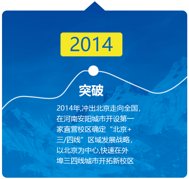 2014年,冲出北京走向全国,在河南安阳城市开设第一家直营校区,确定“北京+三/四线”区域发展战略,以北京为中心,快速在外埠三四线城市开拓新校区