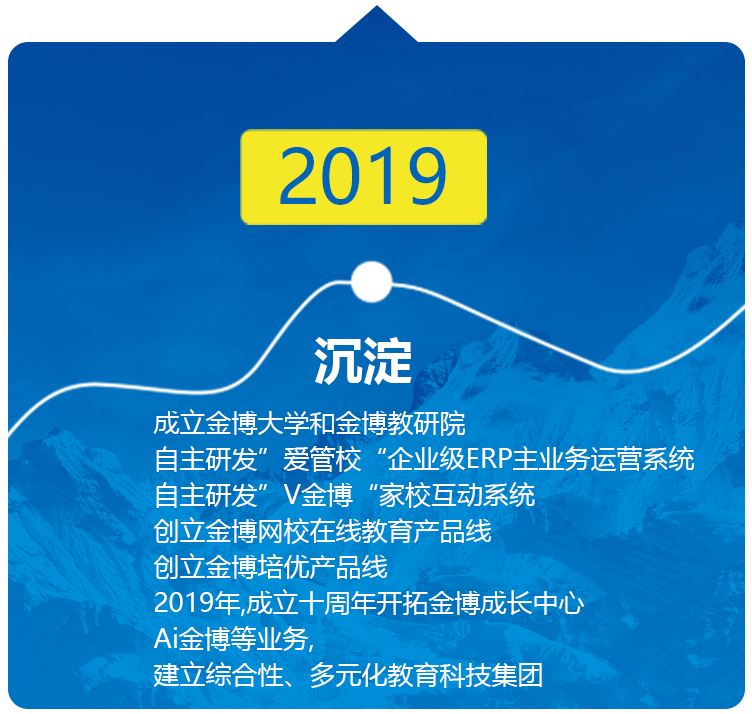 成立金博大学和金博教研院自主研发“爱管校”企业级ERP主业务运营系统,自主研发“V金博”家校互动系统,创立金博网校在线教育产品线,创立金博培优产品线,2019年,成立十周年,开拓金博成长中心、AI金博等业务,建立综合性、多元化教育科技集团